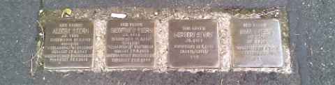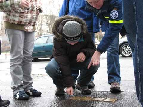 Das Projekt Stolpersteine wurde 1997 von dem Kölner Künstler Gunter Demnig ins Leben gerufen. Er erinnert damit an die Opfer der NS-Zeit, indem er vor ihrem letzten selbst gewählten Wohnort Gedenktafeln aus Messing ins Trottoir einlässt. Bis heute hat er über 5500 Steine in 97 Ortschaften verlegt. "Ein Mensch ist erst vergessen, wenn sein Name vergessen ist", sagt Gunter Demnig. Mit den Steinen vor den Häusern hält er die Erinnerung an die Menschen lebendig, die einst hier wohnten. Auf den Steinen steht geschrieben: | ||||||||||||||||||||||||||||||||||||||||||||||||||||||||||||||||||||||||||||||||||||||